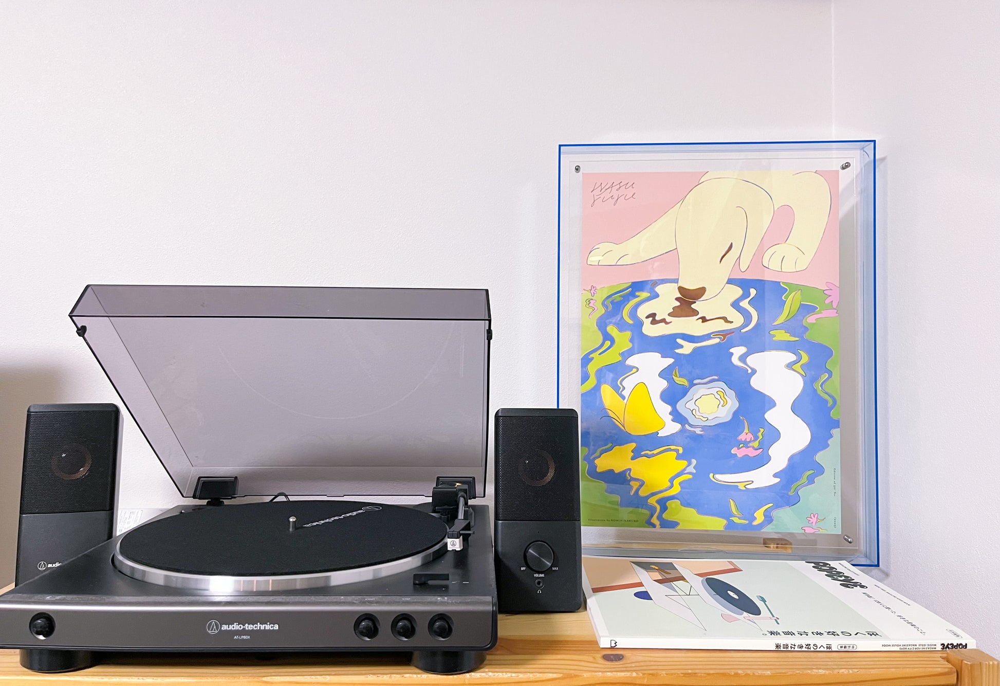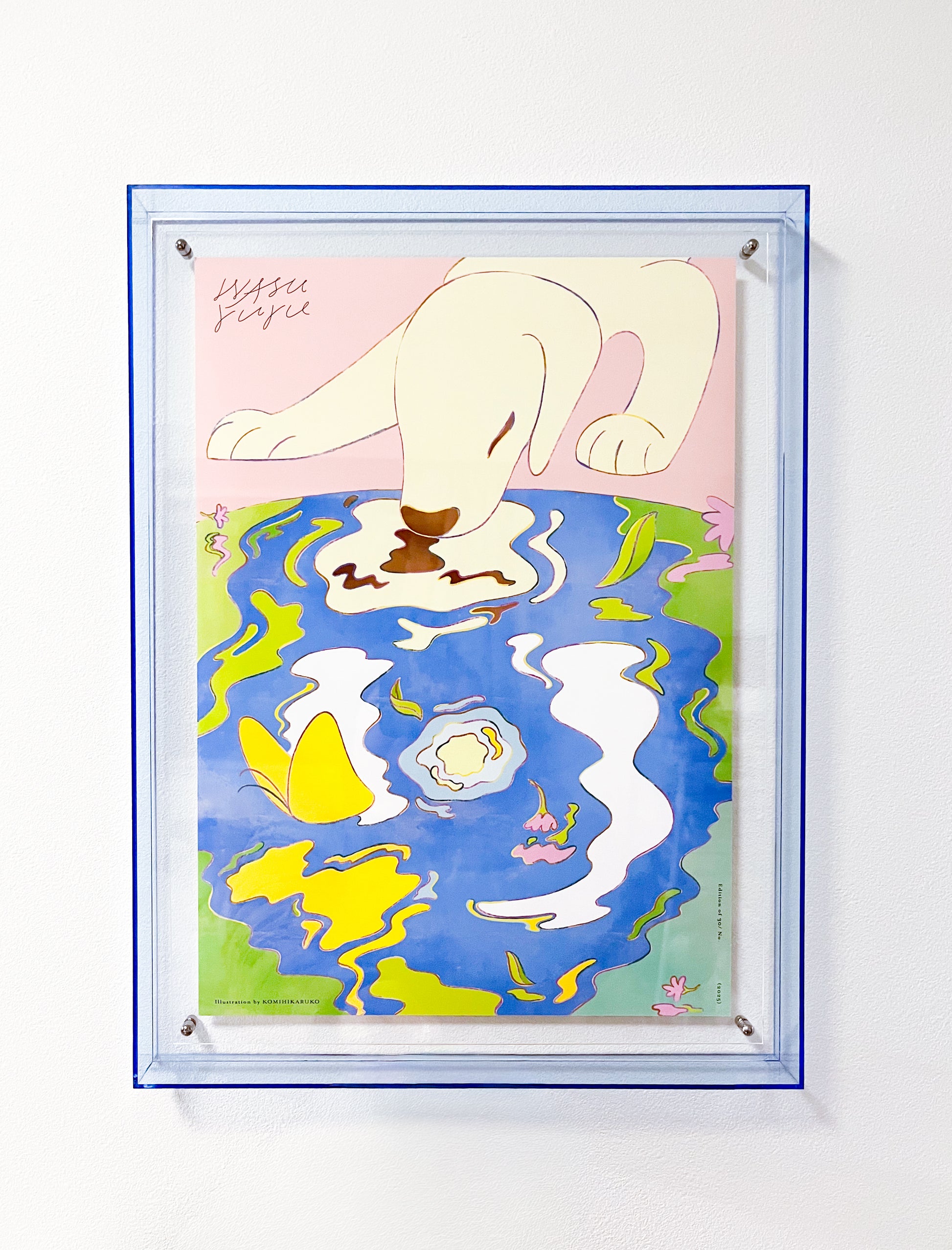 イラストレーター こみひかるこさんと共に制作したオリジナルアートポスター。ブランドコンセプトをもとに、湖の水を静かに飲む犬の姿と、水面に映る光や雲、何気ない静かな時間の美しさを一枚の作品として表現しました。空間に静かな余白と奥行きをもたらす、特別な一枚です。